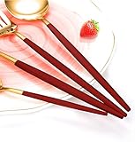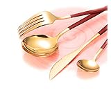 Glossy metallic gold comes from highclass vacuum electroplating technology the golden silverware set features luxury shinning gold mirror finish looking will not easy fading stainless steel flatware demonstrated your elegance dining tastes enjoy dinner with luxurious feeling like restaurant or hotel